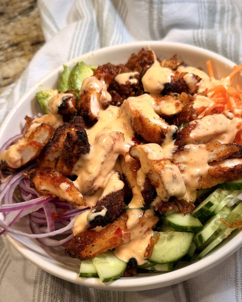 Crispy Rice Bang Bang Bowls are the perfect mix of cozy crunch and fresh flavor. Golden, chili-crisp rice pairs with crisp veggies, tender chicken or shrimp, and a creamy, sweet-spicy bang bang sauce that ties it all together. It’s colorful, crave-worthy, and easy enough for a weeknight — but fun enough to feel a little special.
